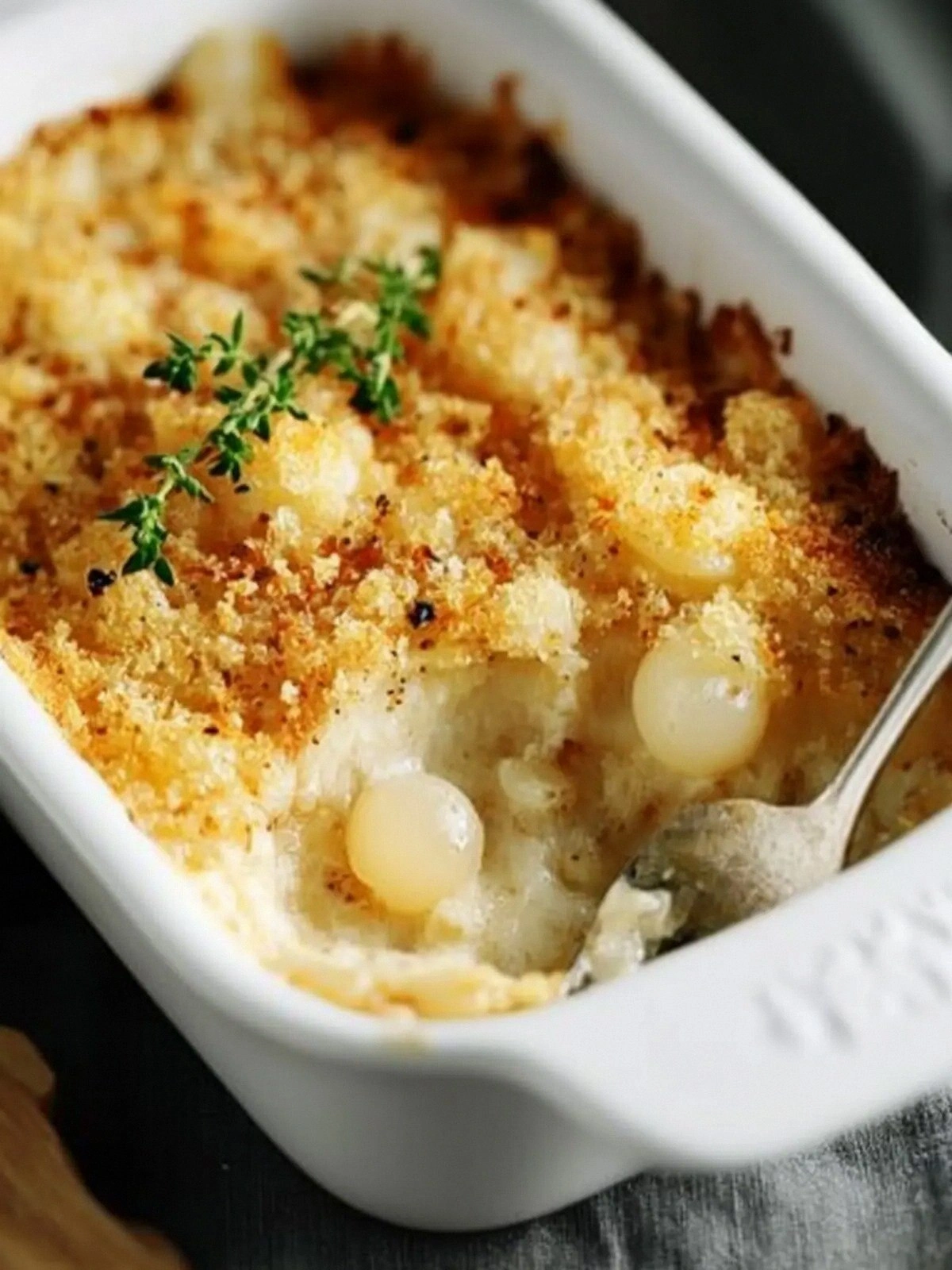 Whole wheat breadcrumbs add a nutty crunch that contrasts with the soft onions and cheese. Their coarse texture holds up during baking, ensuring the gratin’s top remains crisp. Sprinkle the breadcrumbs evenly, then finish with 2 teaspoons of chopped fresh thyme; the thyme releases its essential oils, adding a fragrant herbal note that lingers on the palate. If you’re craving a crunchier finish, double the breadcrumb amount or switch to panko for a lighter, airier bite.