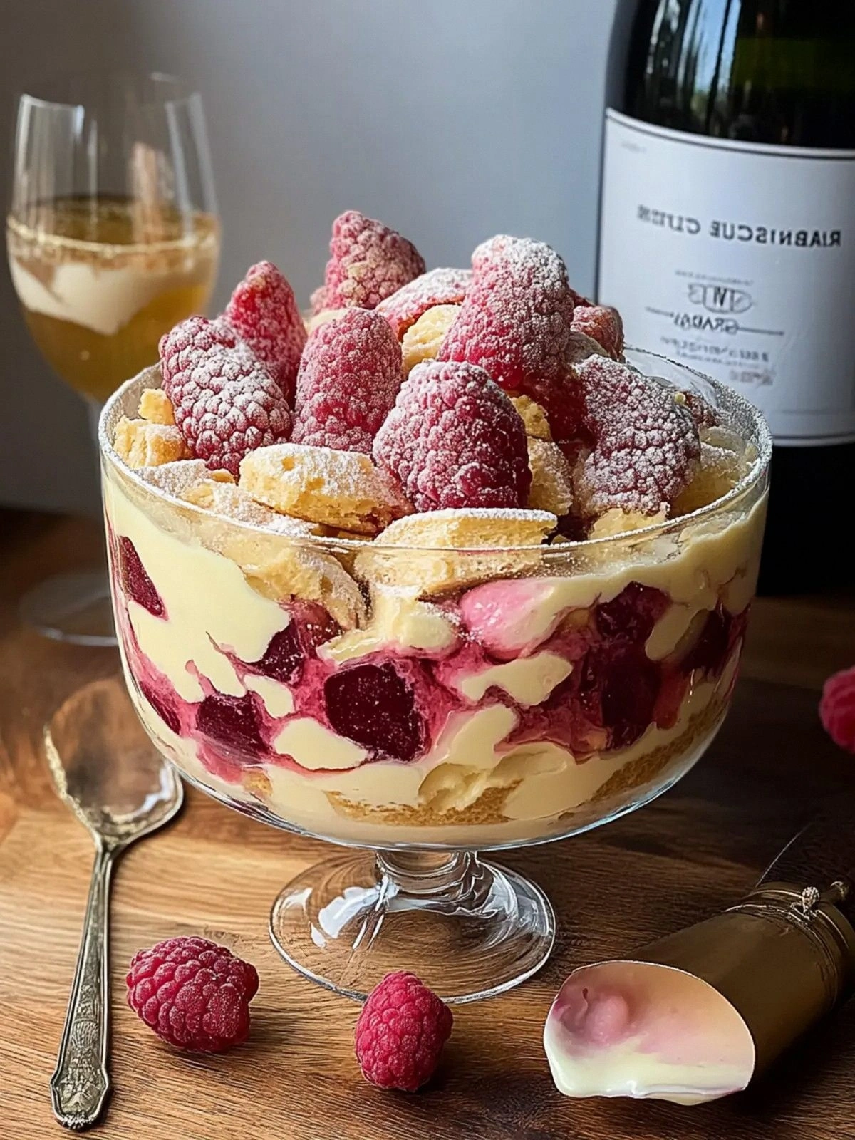 - Step 8: Add the raspberries. Gently fold 650 g fresh raspberries into the top custard layer, allowing some berries to remain whole for a pop of color and burst of juice. The raspberries should be placed in a way that they’re visible from the top, giving the trifle a vibrant, almost jewel‑like appearance.